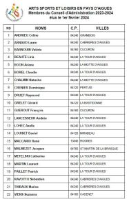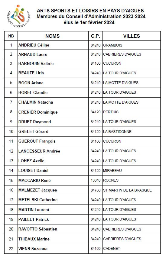 LE CONSEIL D’ADMINISTRATION D’ARTS SPORTS ET LOISIRS EN PAYS D’AIGUES (22 membres bénévoles)